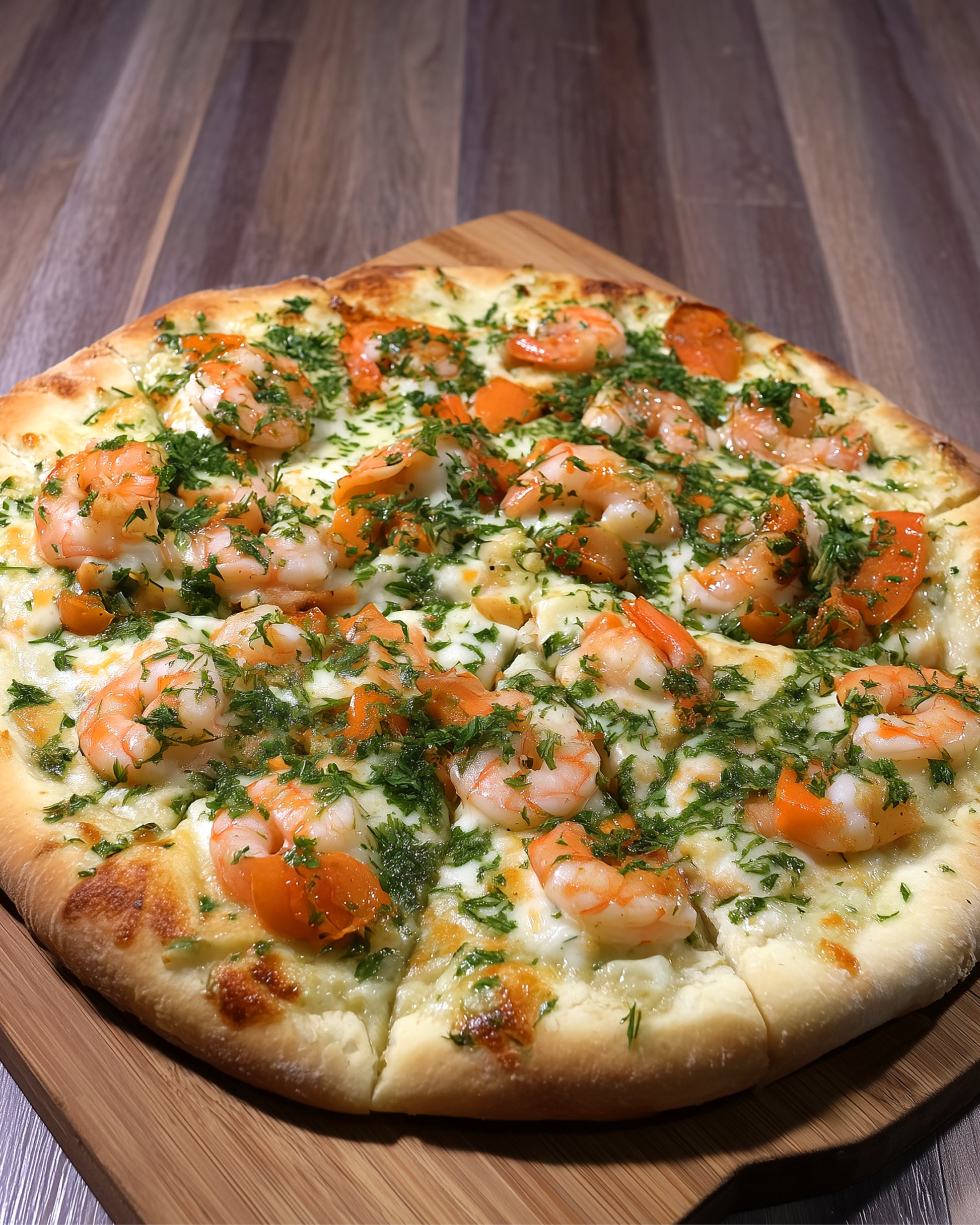 Crème fraîche, Mozzarella & Emmental, Crevettes, Persillade, Olives.
